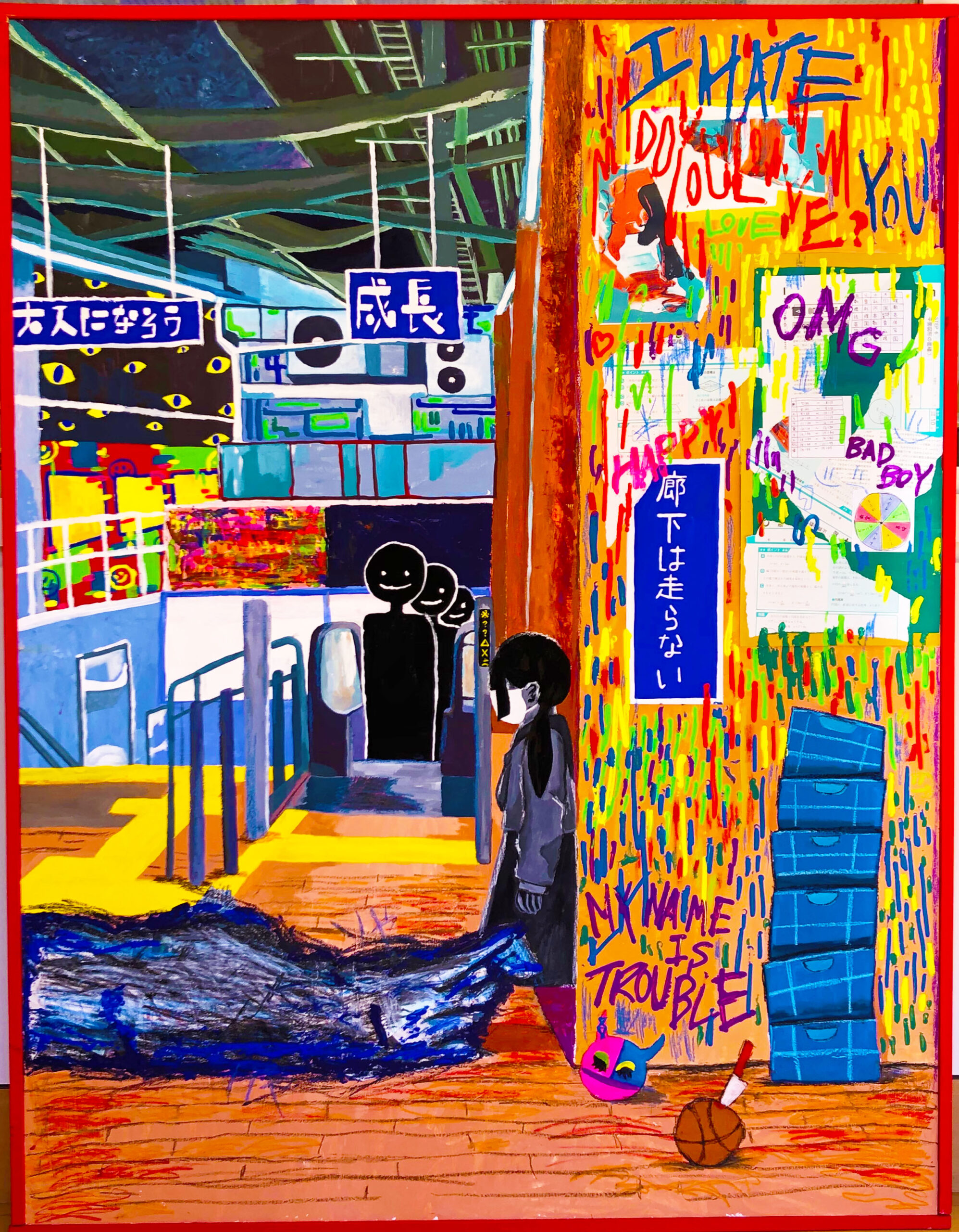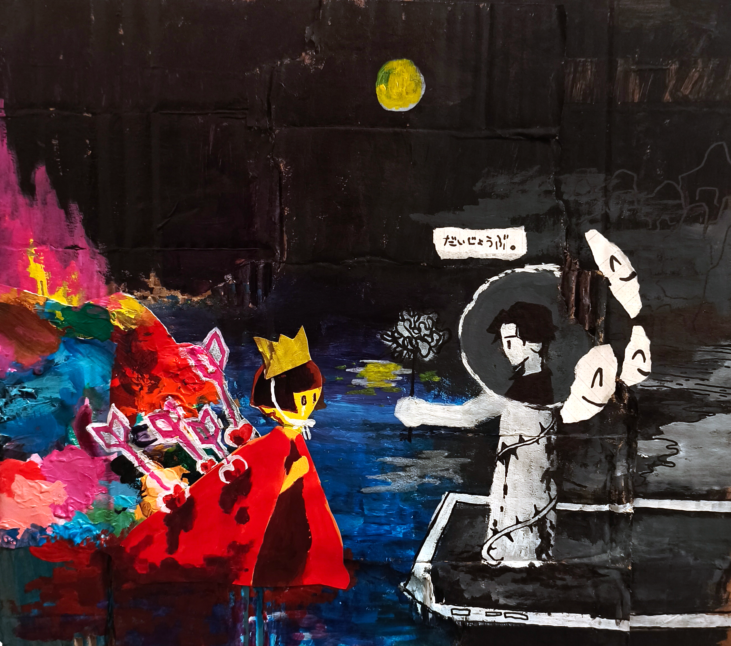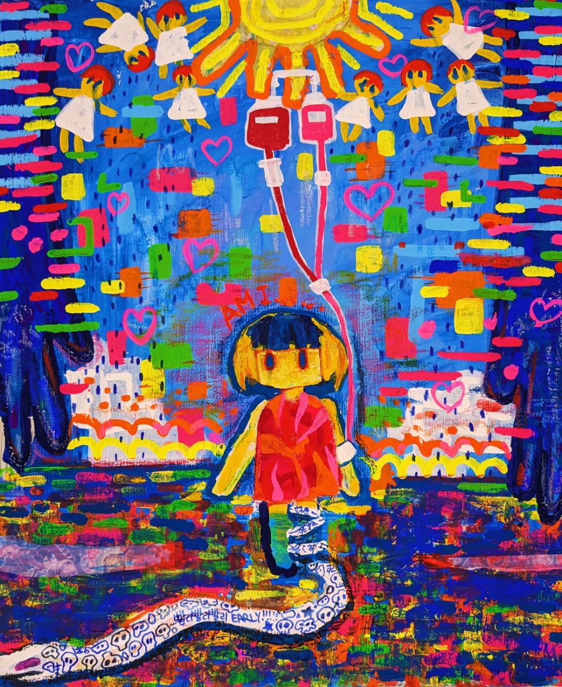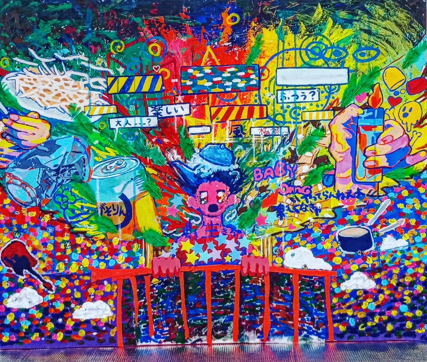 2025年 福岡デザイナー・アカデミー(旧九州デザイナー学院)総合デザイン学科卒業。画家。現在は福岡県を拠点に活動している。「すなおにえがこう」をテーマに、カラフルでありながら少しダークで、どこか懐かしさを感じる世界をミクストメディアで表現している。ここでの「すなお」とは純粋無垢という意味ではなく、作品を通して訴えたい想いをありのままに表現し、表現方法に捉われない制作姿勢を指している。私にとって制作は「記憶の記録」であり、すべての作品は実体験に基づいている。子どもの頃の感覚や成長とともに薄れていく記憶、「忘れたくない」と感じた一瞬の感情を手がかりに制作を行っている。個人的な記憶を起点としながら、SNS社会における現代の情報への向き合い方や不登校、オーバードーズといった自身の経験を通して、現代の若者が抱える社会的な問題とも結びつけて表現している。作品を通じて、観る人自身の記憶や感情、そして社会と静かに重なり合う体験が生まれることを大切にしている。